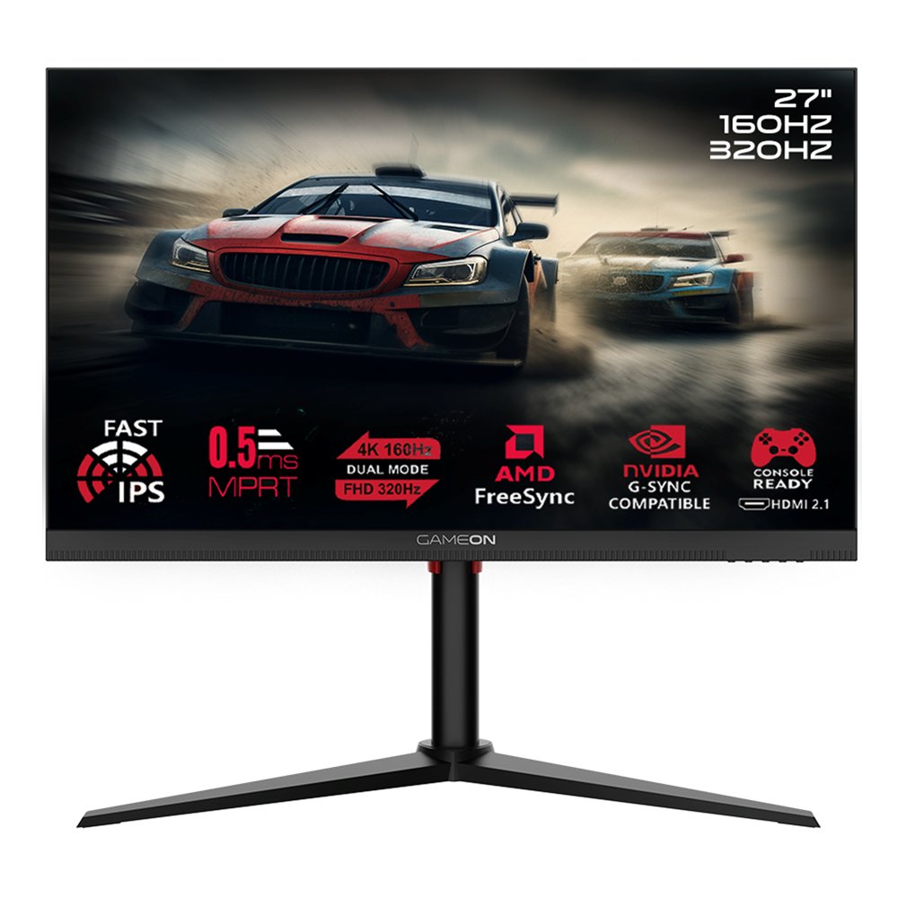شاشة ألعاب GAMEON مقاس 27 بوصة – سلسلة Switch X – وضع مزدوج 4K UHD ‏160Hz / FHD ‏320Hz، زمن استجابة ‎0.5 ملثانية، لوحة Fast IPS، HDMI 2.1، سماعة مدمجة، اللون أسود.