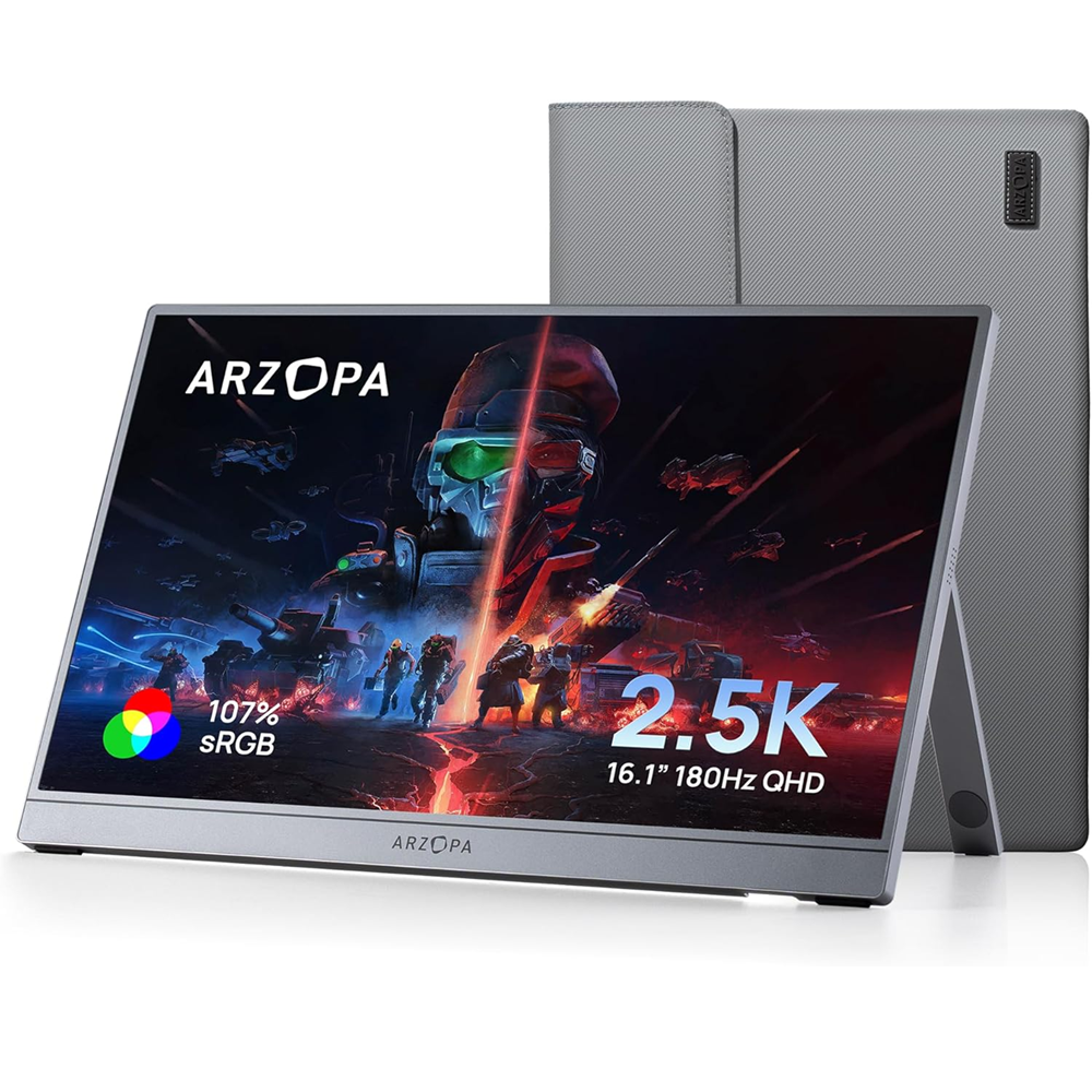 - Arzopa 16.1″ Z3FC شاشة ألعاب محمولة بدقة 2K، معدل تحديث 180Hz، لوحة IPS، مع سماعات ومنافذ Mini HDMI وUSB-C