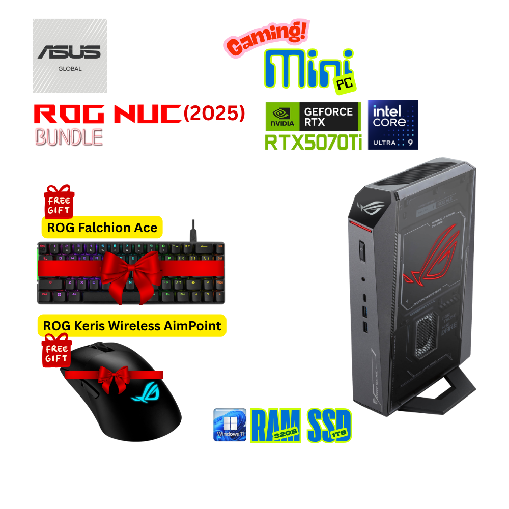 - ASUS NUC15JNK ROG NUC (2025) Bundle Gaming Mini PC, Intel Ultra 9, RTX 5070Ti, 32GB RAM, 1TB SSD, Win11, ASUS M602 Keyboard, ASUS P709 Mouse