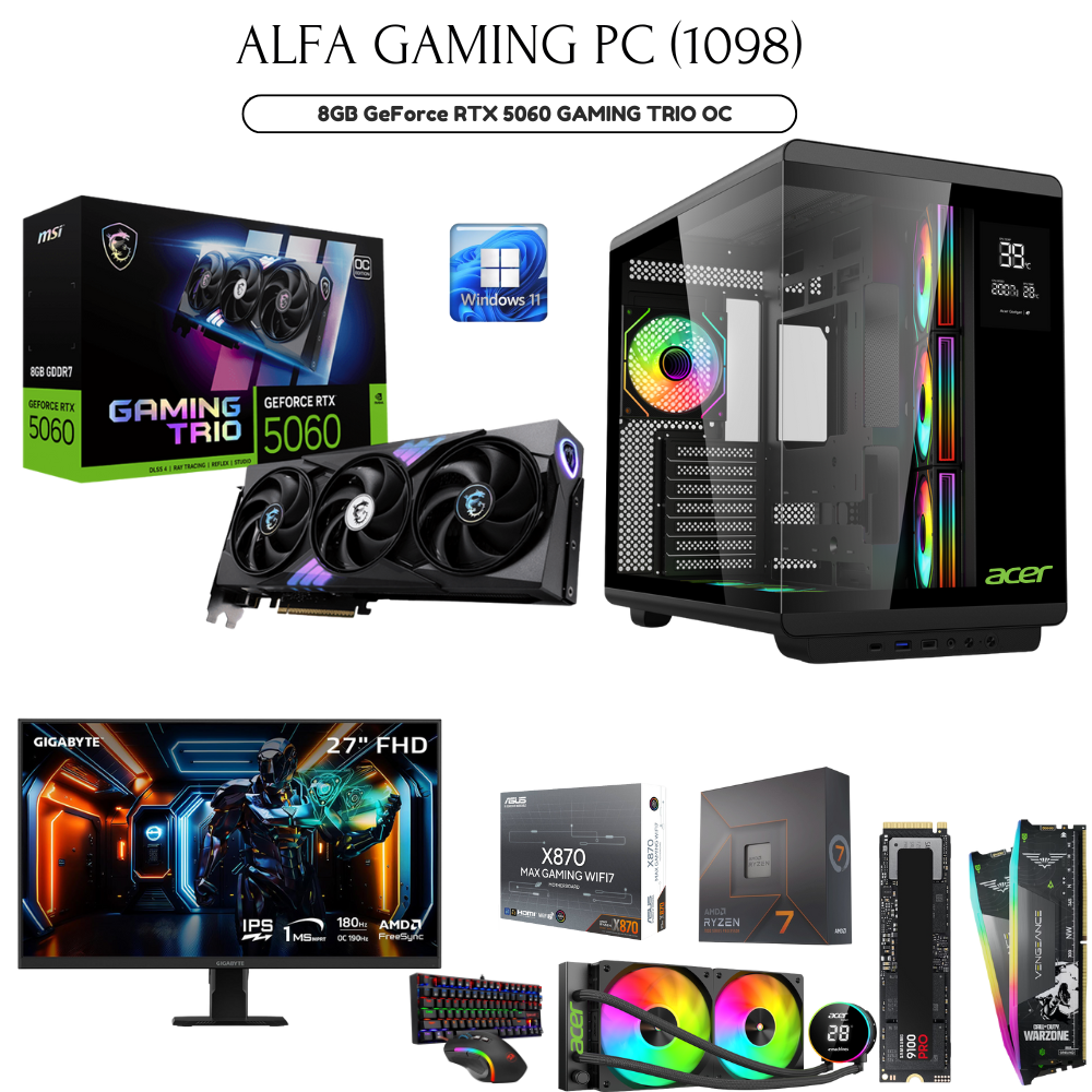 Alfa Gaming PC 1098 AMD 7700X, 8GB RTX5060, 32GB RAM, 1TB SSD, Gigabyte 27″ 180Hz, Acer U600B, W11Pro, Bundle Combo
