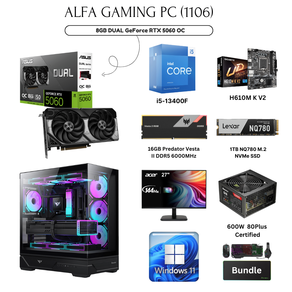 Alfa Gaming PC 1106 Intel Core i5-13400F Processor Lexar 1TB NV2 M.2 NVMe SSD, 6500MB/s ASUS 8GB DUAL GeForce RTX 5060 OC Edition VGA Acer 27″ EK271 P6 144Hz 1ms Speaker FHD IPS Monitor Huntkey MVP Destiny Mid Tower PC Case – Black, 4 Fans Acer 16GB Predator Vesta II DDR5 6000MHz RAM, (16GB x1) Sharx JS4X1 4 in 1 Gaming RGB Combo Bundle, Keyboard, Mouse, Headset, Mouse Pad USB WiFi 5G / Win11Pro