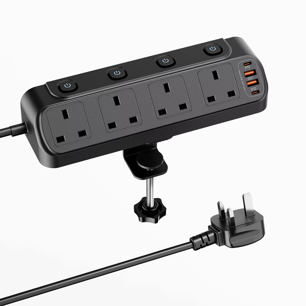 - Clamp-mounted Extension Socket: Desktop extension block comes with durable clamp and 1.8m cable, can be securely installed on the desktop surface using edge mounting brackets. It can be clamped to the back of a desk or wall corner for semi-permanent installation, preventing it from being knocked back into a pile of cables.