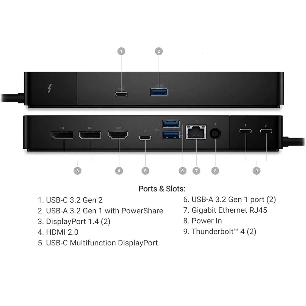 Dell Dock Station 1 x HDMI 2.0 2 x DisplayPort 1.4 1 x USB-C 3.2 Gen 2 2 x Thunderbolt-4 ports 1 x USB-C Multifunction DisplayPort 1 x USB-A 3.2 Gen 1 with PowerShare